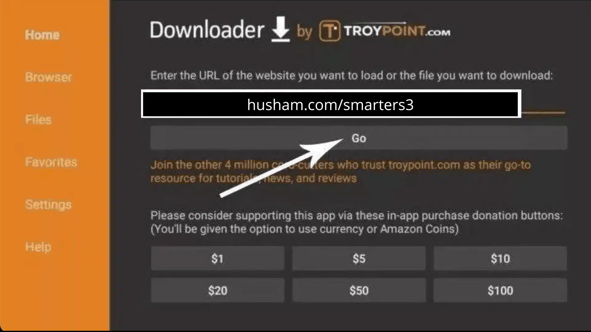 16. Saisissez l'URL suivante exactement comme indiqué ici : https://www.iptvsmarters.com/smarters.apk et cliquez sur « Go ».